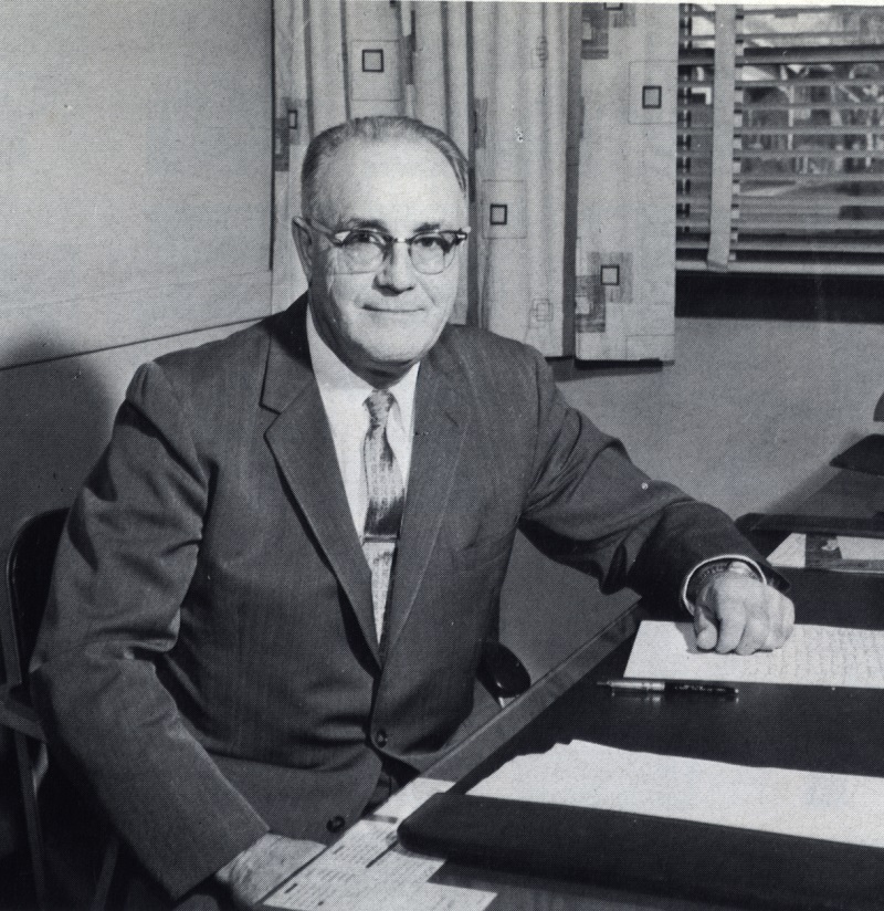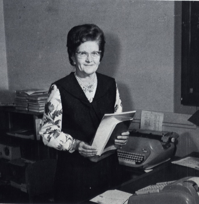 Olive Thiel - Secretary to the principal, pauses for a moment from the many tasks that make up her always busy day.
