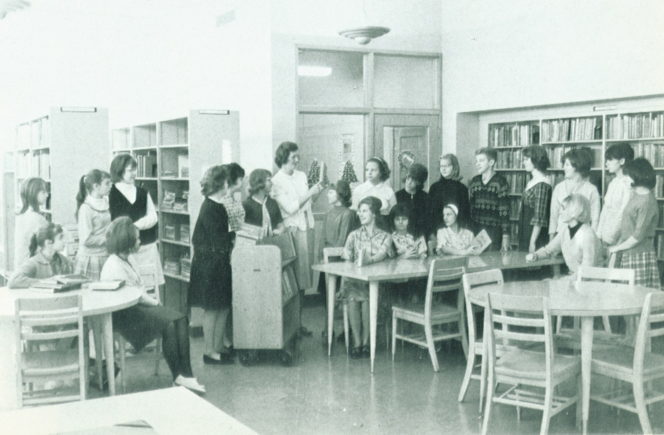 The library aides do much of the work that keeps the library running smoothly. Here Mrs Pais shows them how a fiction book is marked. |