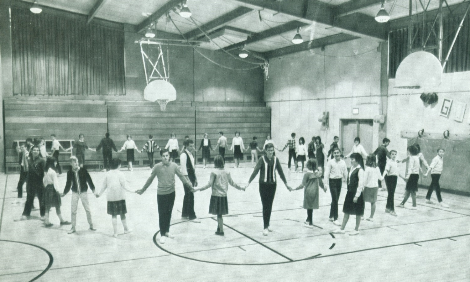 Included in the physical education program each year is three weeks of dancing. On the left Mrs. Epperson and Mr. Bergdolt's classes demonstrate folk dancing and on the right Miss Stocking and Mr Long's classes show the fine art of square dancing. |