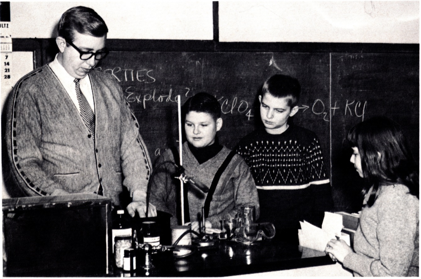 Science -- 7th Grade Terry Bushnell, Jack Dahlquist, and Karen Mallehan watch closely as Mr. Swendsen experiments with making oxygen. |