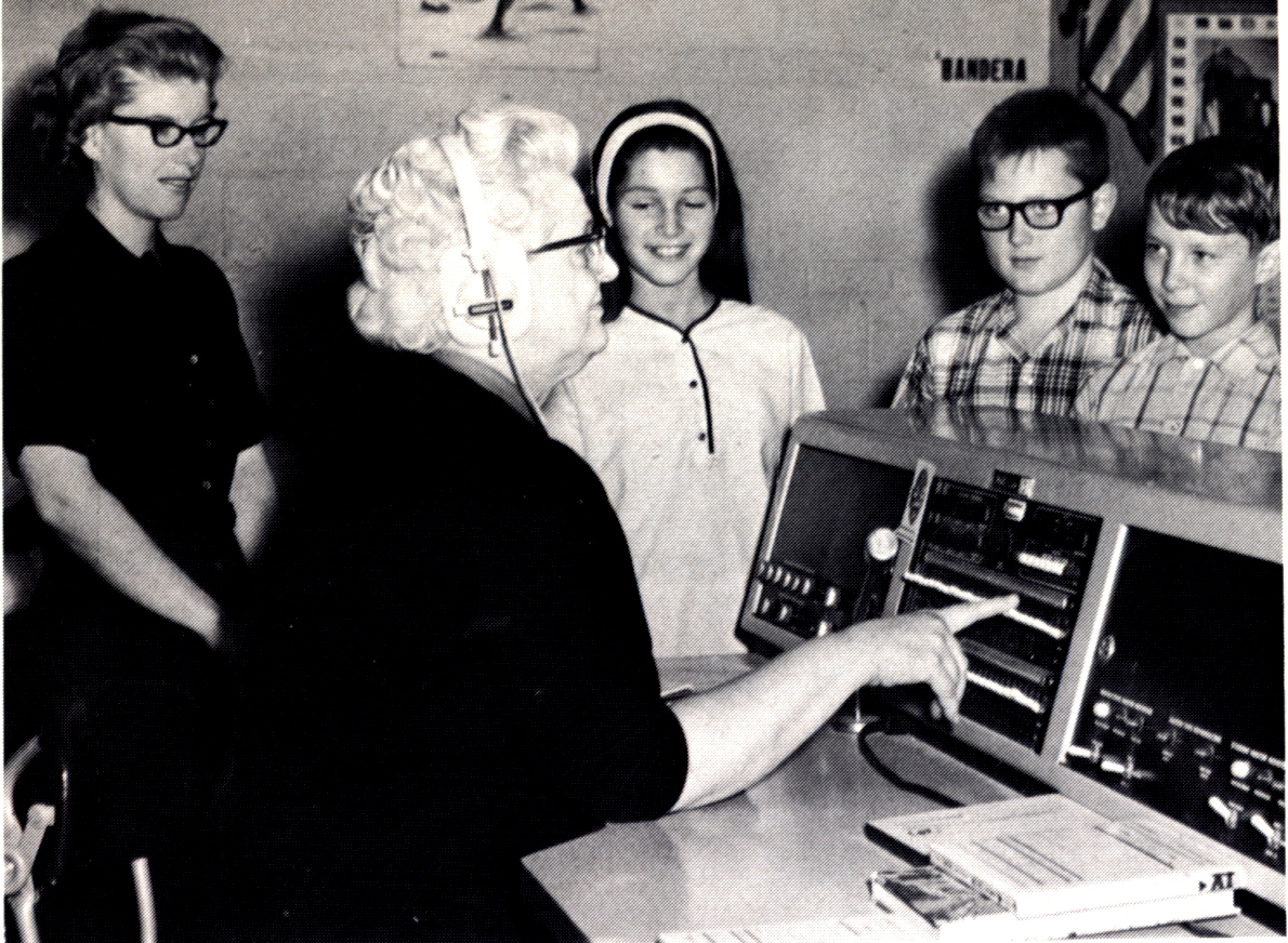 Spanish teachers, Mrs. Christie and Mrs Lockwood explain the use of the Spanish Laboratory to Spanish students Joan Zaur, Scott Spilis, and Don Frantz. |