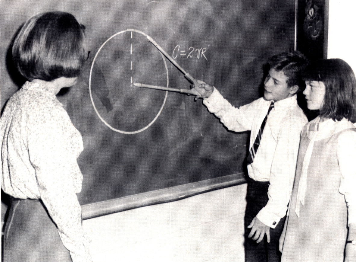 Eddie Babe, Celeste Gericke demonstare for the class and Miss Magnuson how the circumference of a circle can be found. |