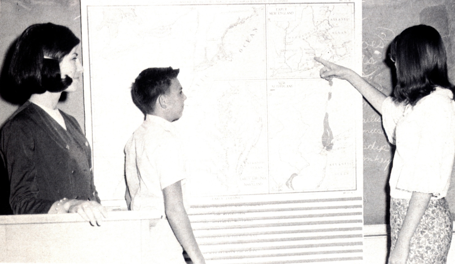Bill Hastings and Karen Zaur assist Mrs. Klein's Ammerican History class in its efforts to name and locate the 13 colonies. |