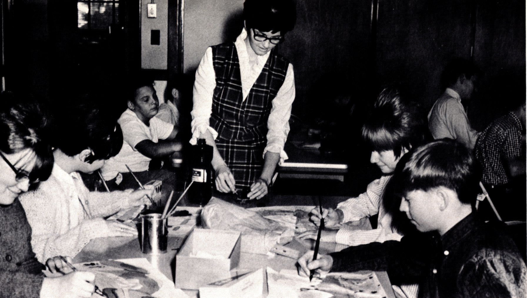 MEMORIAL JUNIOR HIGH 1967 - Art Class & Sewing7IX Mr. Swendsen | Science | 8III and 7V and 8VIII | Spanish & Math | Geography Class | Art Class & Sewing scan | Gym Class Outdoors | Cheerleaders | Basketball | Concert Band | Student Council |