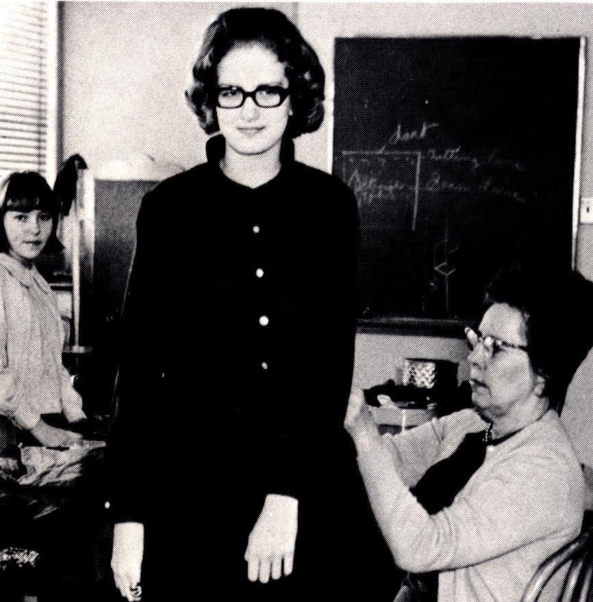 Miss Logsdon fits a skirt on Joan McDonald in sewing class. |