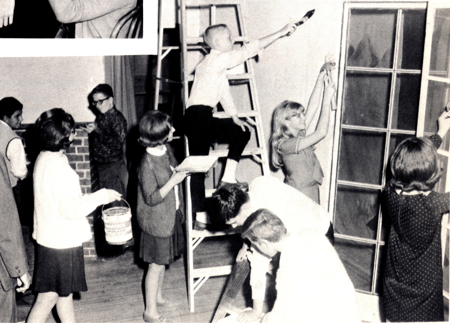 Members of Dramatics Club demonstrate their many talents as they discard their play books for paint, brushes, hammer, and nails in an attempt to put the finishing touches to the set for "The Perfect Idiot." |