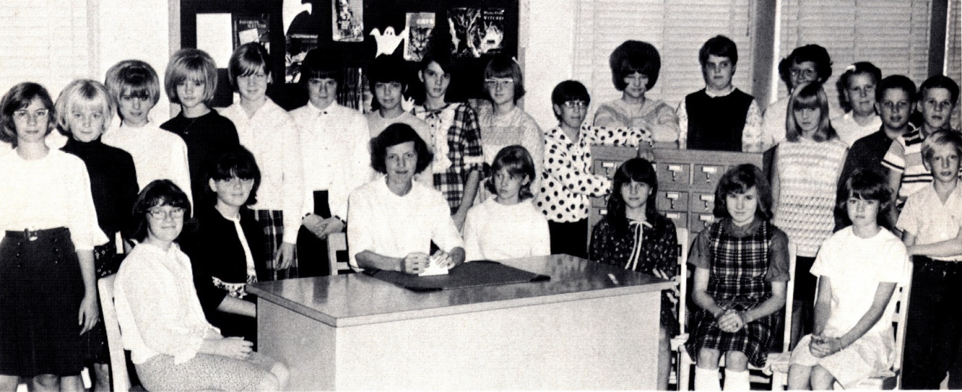 Mrs. Pais and her library aides gather in the library. A few girls I can identify are Dana Wright, Vickie Babe, Denise Hutchison, Edith Marich, William Hastings, Marilyn Ditter, and Kathy Kreps. Email spiralblue@yahoo.com if you know others in 67_038b. |