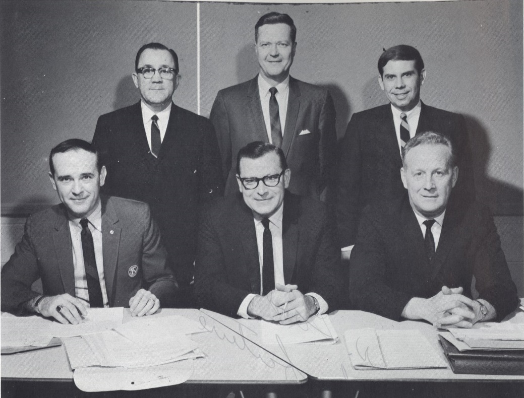 School Board members from left to right are: seated, Mr. Jack Ruff, Mr. Charles Hudson, Mr. Joseph Winkler; standing, Mr. Joseph Borberly, Mr. Robert Collins, and Mr. Donald Sobczak; not pictured: Mr. Ralph Voss. |