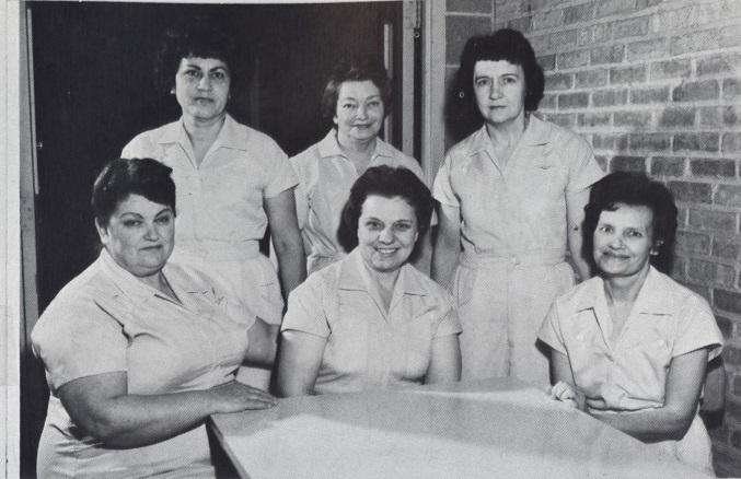 CLEANING STAFF: Seated Helen Evans, Mary Zat, Sue Cermak. Standing Mary Cantu, Muriel Peterson, Marge Tiemens |