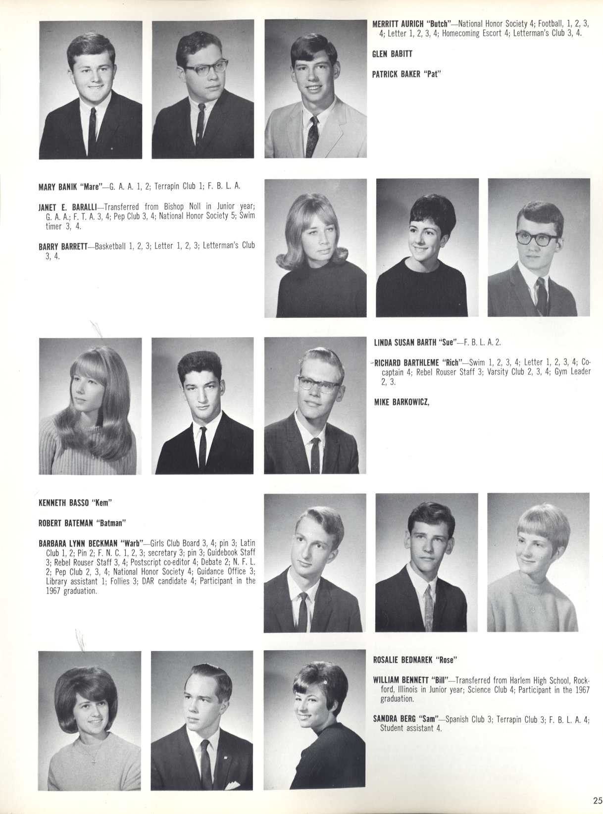 Pictured on Page 25: MERRITT AURICH "Butch"—National Honor Society 4; Football, 1, 2,3,4; Letter 1,2, 3, 4; Homecoming Escort 4; Letterman's Club 3, 4. GLEN BABITT PATRICK BAKER "Pat" MARY BANIK "Mare"-G. A. A. 1, 2; Terrapin Club 1; F. B. L. A. JANET E. BARALLI—Transferred from Bishop Noll in Junior year; G. A. A.; F. T. A. 3, 4; Pep Club 3, 4; National Honor Society 5; Swimtimer 3, 4. BARRY BARRETT—Basketball 1, 2,3; Letter 1,2,3; Letterman's Club 3, 4. LINDA SUSAN BARTH "Sue"—F. B. L. A. 2. RICHARD BARTHLEME "Rich"—Swim 1, 2, 3, 4; Letter 1, 2, 3, 4; Cocaptain 4; Rebel Rouser Staff 3; Varsity Club 2, 3, 4; Gym Leader 2, 3. MIKE BARKOWICZ, 41 in KENNETH BASSO "Kern" ROBERT BATEMAN "Batman" BARBARA LYNN BECKMAN "Warb" Girls Club Board 3, 4; pin 3; Latin Club 1, 2; Pin 2; F. N. C. 1, 2,3; secretary 3; pin 3; Guidebook Staff 3; Rebel Rouser Staff 3,4; Postscript co-editor 4; Debate 2; N. F. L. 2; Pep Club 2, 3, 4; National Honor Society 4; Guidance Office 3;Library assistant 1; Follies 3; DAR candidate 4; Participant in the 1967 graduation.i l k ROSALIE BEBNAREK "Rose" WILLIAM BENNETT "Bill"—Transferred from Harlem High School, Rockford, Illinois in Junior year; Science Club 4; Participant in the 1967 graduation. SANDRA BERG "Sam"—Spanish Club 3; Terrapin Club 3; F. B. L. A. 4; Student assistant 4.