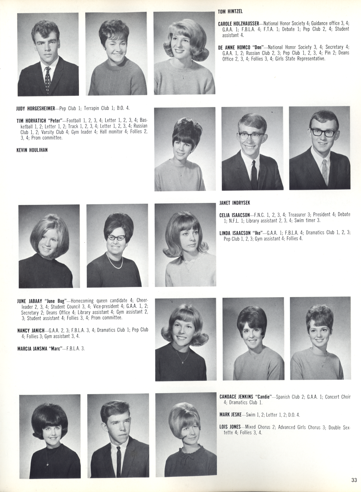 Pictured on Page 33: TOM HINTZEL CAROLE HOLZHAUSSER National Honor Society 4; Guidance office 3,4; G.A.A. 1; F.B.L.A. 4; F.T.A. 1; Debate 1; Pep Club 2, 4; Student assistant 4. DE ANNE HOMCO "Don"—National Honor Society 3, 4; Secretary 4; G.A.A. 1, 2; Russian Club 2, 3; Pep Club 1, 2, 3, 4; Pin 2; Deans Office 2, 3,4; Follies 3, 4; Girls State Representative. JUDY HORGESHEIMER—Pep Club 1; Terrapin Club 1; D.O. 4. TIM HORVATICH "Peter"—Football 1, 2, 3, 4; Letter 1, 2, 3, 4; Basketball 1, 2; Letter 1, 2; Track 1, 2, 3, 4; Letter 1, 2, 3, 4; Russian Club 1, 2; Varsity Club 4; Gym leader 4; Hall monitor 4; Follies 2, 3, 4; Prom committee. KEVIN HOULIHAN JANET INDRYSEK CELIA ISAACSON—F.N.C. 1, 2, 3, 4; Treasurer 3; President 4; Debate 1; N.F.L. 1; Library assistant 2, 3, 4; Swim timer 3. LINDA ISAACSON "Ike"—G.A.A. 1; F.B.L.A. 4; Dramatics Club 1, 2, 3; Pep Club 1, 2, 3; Gym assistant 4; Follies 4. JUNE JABAAY "June Bug"-Homecoming queen candidate 4; Cheerleader 2, 3, 4; Student Council 3, 4; Vice-president 4; G.A.A. 1, 2; Secretary 2; Deans Office 4; Library assistant 4; Gym assistant 2, 3; Student assistant 4; Follies 3, 4; Prom committee. NANCY JANICH G.A.A. 2, 3; F.B.L.A. 3, 4; Dramatics Club 1; Pep Club 4; Follies 3; Gym assistant 3, 4. MARCIA JANSMA "Marc"—F.B.L.A. 3. -1 CANDACE JENKINS "Candie" Spanish Club 2; G.A.A. 1; Concert Choir 4; Dramatics Club 1. MARK JESKE Swim 1, 2; Letter 1, 2; D.O. 4. LOIS JONES Mixed Chorus 2; Advanced Girls Chorus 3; Double Sextette 4; Follies 3, 4.