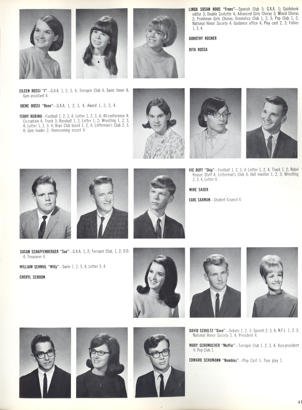 Pictured on Page 41: LINDA SUSAN ROOS "Froos"—Spanish Club 3; G.A.A. 1; Guidebook editor 3; Double Sextette 4; Advanced Girls Chorus 3; Mixed Chorus 2; Freshman Girls Chorus; Dramatics Club 1, 2, 3; Pep Club 1, 2; National Honor Society 4; Guidance office 4; Play cast 2,3; Follies 1,3,4. DOROTHY ROSNER RITA ROSSA EILEEN ROSSI "I"—G.A.A. 1, 2, 3, 4; Terrapin Club 4; Swim timer 4; Gym assistant 4. IRENE ROSSI "Rene"—G.A.A. 1, 2, 3, 4; Award 1, 2, 3, 4. TERRY RUBINO—Football 1, 2, 3, 4; Letter 1, 2, 3, 4; All-conference 4; Co-captain 4; Track 3; Baseball 1. 2; Letter 1, 2; Wrestling 1, 2, 3, 4; Letter 1, 2, 3, 4; Boys Club board 1, 2, 4; Letterman's Club 2, 3, 4; Gym leader 2; Homecoming escort 4. VIC RUFF "Skip"—Football 1, 2, 3, 4; Letter 1, 2, 4; Track 1, 2; Rebel Rouser Staff 4; Letterman's Club 4; Hall monitor 1, 2. 3; Wrestling 2, 3, 4; Letter 4. SUSAN SCHAFFENBERGER "Sue"—G.A.A. 1, 2; Terrapin Club, 1, 2; DO 4; Treasurer 4. WILLIAM SCHMUL "Willy" Swim 1, 2, 3. 4; Letter 3, 4. CHERYL SCHOON DAVID SCHULTZ "Dave"—Debate 1. 2.3; Speech 2, 3, 4; N.F.L. 1. 2, 3; National Honor Society 3. 4; President 4. MARY SCHUMACHER "Muffie"—Terrapin Club 1. 2, 3, 4; Vice-president 4: Pep Club 1. EDWARD SCHUMANN "Humbles"—Play Cast 1; Tour play 1.