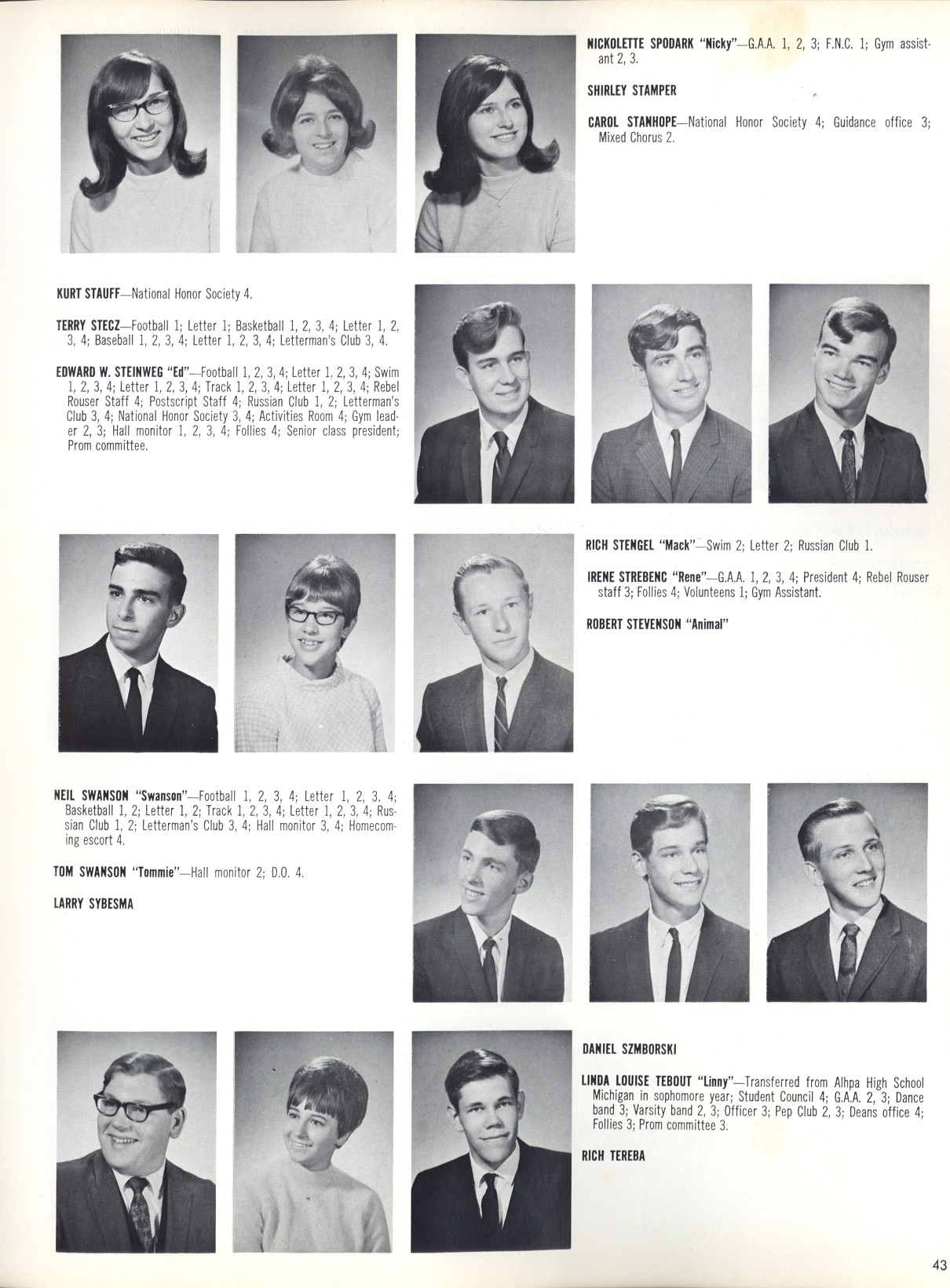 Pictured on Page 43: NICKOLETTE SPODARK "Nicky"—G.A.A. 1, 2, 3; F.N.C. 1; Gym assistant 2, 3. SHIRLEY STAMPER CAROL STANHOPE—National Honor Society 4; Guidance office 3; Mixed Chorus 2. KURT STAUFF—National Honor Society 4. TERRY STECZ—Football 1; Letter 1; Basketball 1, 2, 3, 4; Letter 1, 2, 3, 4; Baseball 1,2,3, 4; Letter 1,2,3, 4; Letterman's Club 3, 4. EDWARD W. STEINWEG "Ed"—Football 1, 2, 3,4; Letter 1. 2, 3, 4; Swim 1, 2, 3, 4; Letter 1, 2, 3, 4; Track 1, 2, 3, 4; Letter 1, 2, 3, 4; Rebel Rouser Staff 4; Postscript Staff 4; Russian Club 1, 2; Letterman's Club 3, 4; National Honor Society 3, 4; Activities Room 4; Gym leader 2, 3; Hall monitor 1, 2, 3, 4; Follies 4; Senior class president; Prom committee. RICH STENGEL "Mack"-Swim 2; Letter 2; Russian Club 1. IRENE STREBENC "Rene"—G.A.A. 1, 2, 3, 4; President 4; Rebel Rouser staff 3; Follies 4; Volunteens 1; Gym Assistant. ROBERT STEVENSON "Animal" NEIL SWANSON "Swanson"—Football 1, 2, 3, 4; Letter 1, 2, 3. 4; Basketball 1,2; Letter 1, 2; Track 1,2,3, 4; Letter 1,2,3,4; Russian Club 1, 2; Letterman's Club 3, 4; Hall monitor 3, 4; Homecoming escort 4. TOM SWANSON "Tommie"—Hall monitor 2; D.O. 4. LARRY SYBESMA DANIEL SZMBORSKI LINDA LOUISE TEBOUT "Linny"—Transferred from Alhpa High School Michigan in sophomore year; Student Council 4; G.A.A. 2, 3; Dance band 3; Varsity band 2, 3; Officer 3; Pep Club 2, 3; Deans office 4; Follies 3; Prom committee 3. RICH TEREBA