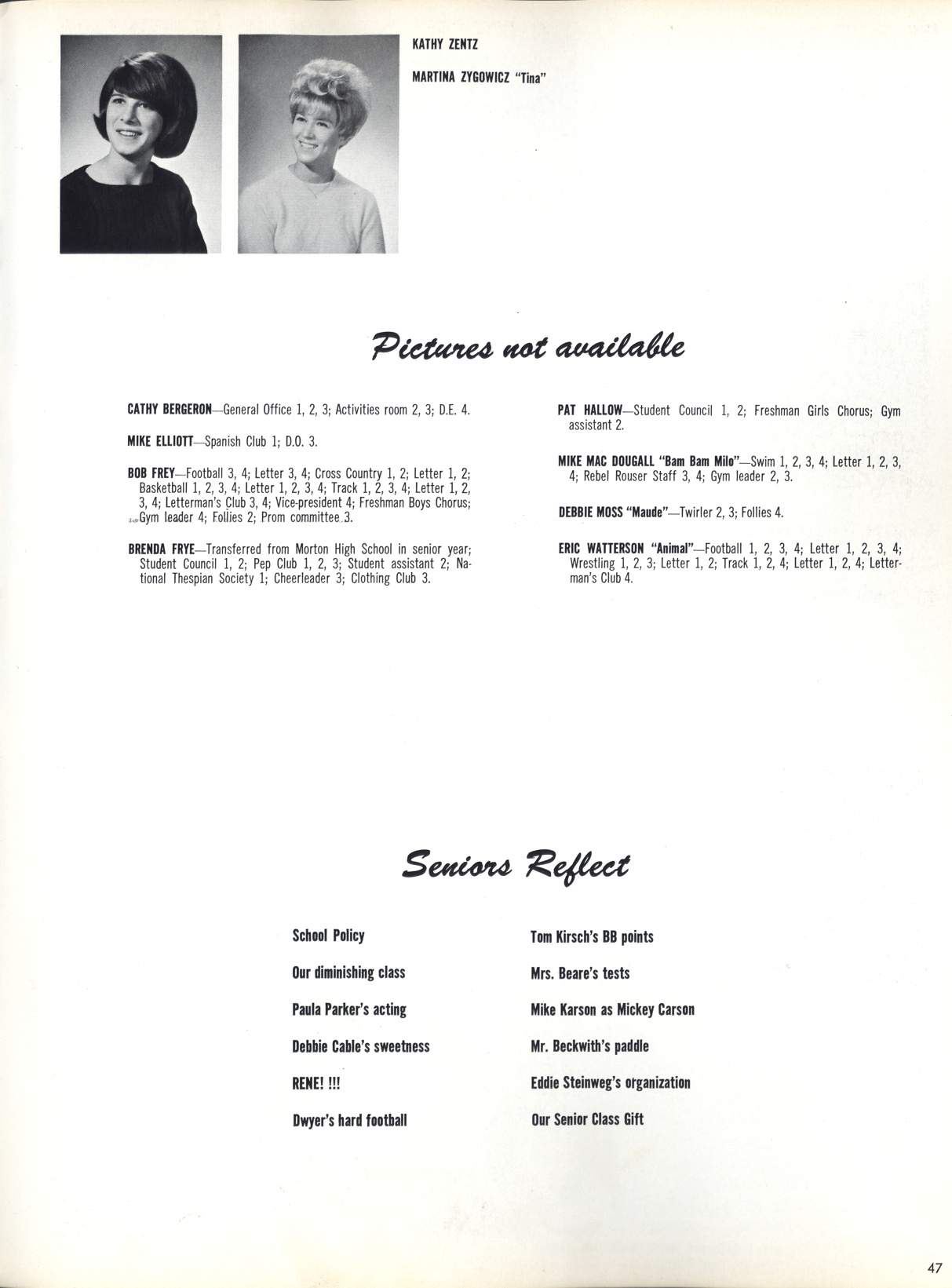 Pictured on Page 47: KATHY ZENTZ MARTINA ZY60WICZ "Tina" 'PictwieA not aiKzilaUe CATHY BERGERON—General Office 1, 2, 3; Activities room 2, 3; D.E. 4. MIKE ELLIOTT Spanish Club 1; D.O. 3. BOB FREY—Football 3, 4; Letter 3, 4; Cross Country 1, 2; Letter 1,2; Basketball 1,2,3, 4; Letter 1,2,3, 4; Track 1, 2, 3, 4; Letter 1, 2, 3, 4; Letterman's Club 3, 4; Vice-president 4; Freshman Boys Chorus; i .Gym leader 4; Foliies 2; Prom committee 3. BRENDA FRYE—Transferred from Morton High School in senior year; Student Council 1, 2; Pep Club 1, 2, 3; Student assistant 2; National Thespian Society 1; Cheerleader 3; Clothing Club 3. PAT HALLOW—Student Council 1, 2; Freshman Girls Chorus; Gym assistant 2. MIKE MAC DOUGALL "Bam Bam Milo"—Swim 1, 2, 3, 4; Letter 1, 2, 3, 4; Rebel Rouser Staff 3, 4; Gym leader 2, 3. DEBBIE MOSS "Maude"—Twirler 2, 3; Follies 4. ERIC WATTERSON "Animal"—Football 1, 2, 3, 4; Letter 1, 2, 3, 4; Wrestling 1,2,3; Letter 1,2; Track 1,2, 4; Letter 1,2, 4; Letterman's Club 4. S&UOM, Reflect School Policy Our diminishing class Paula Parker's acting Debbie Cable's sweetness RENE!!!! Dwyer's hard football Tom Kirsch's BB points Mrs. Beare's tests Mike Karson as Mickey Carson Mr. Beckwith's paddle Eddie Steinweg's organization Our Senior Class Gift