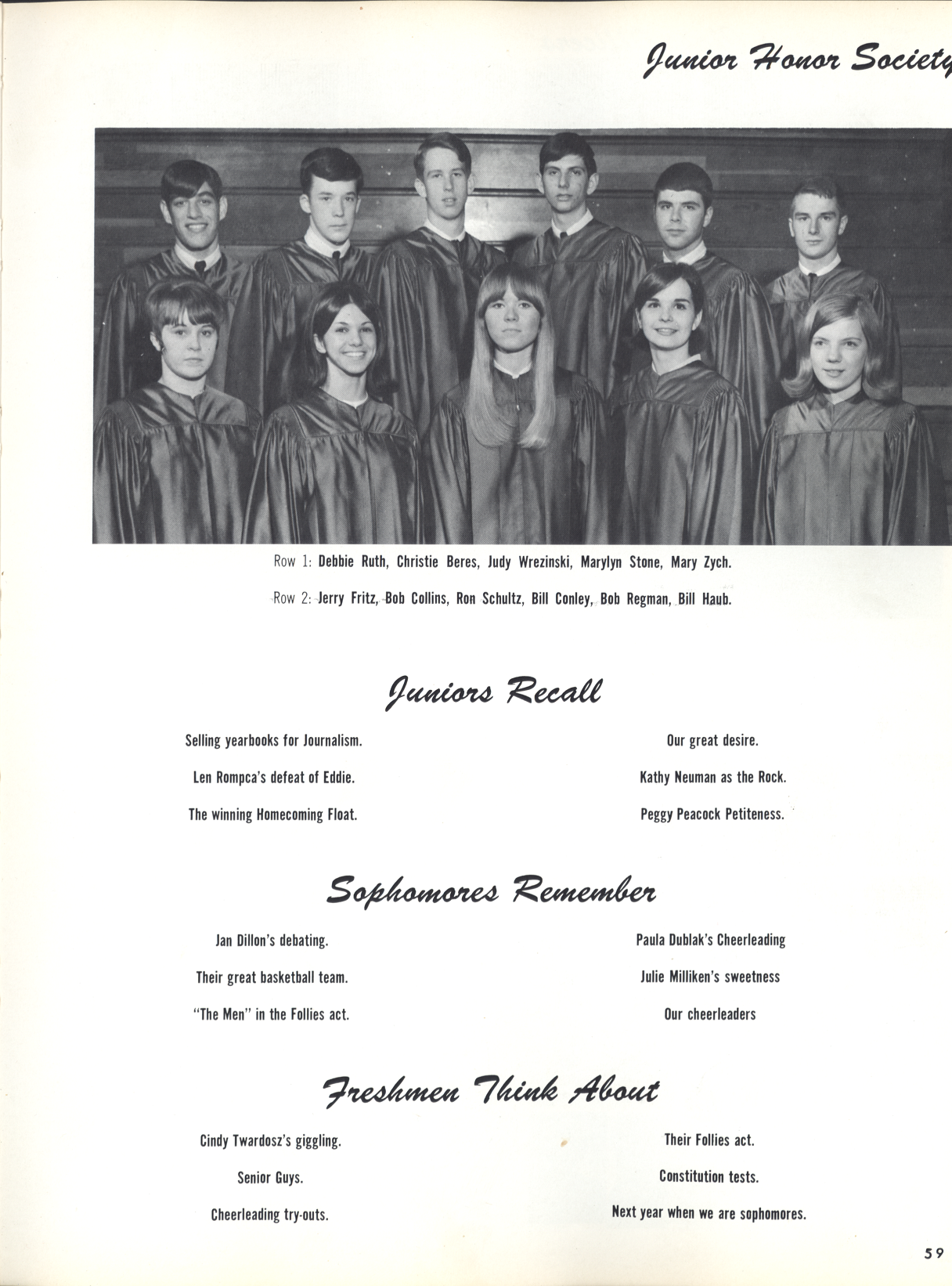 Pictured on Page 59: JUNIOR HONOR SOCIETY Row 1: Debbie Ruth, Christie Beres, Judy Wrezinski, Marylyn Stone, Mary Zych. Row 2: Jerry Fritz, Bob Collins, Ron Schultz, Bill Conley, Bob Regman, Bill Haub. JUNIORS RECALL: Selling yearbooks for Journalism. Our great desire. Len Rompca's defeat of Eddie. Kathy Neuman as the Rock. The winning Homecoming Float. Peggy Peacock Petiteness. SOPHOMORES REMEMBER: Jan Dillon's debating. Paula Dublak's Cheerleading Their great basketball team. Julie Milliken's sweetness "The Men" in the Follies act. Our cheerleaders FRESHMEN THINK ABOUT: Cindy Twardosz's giggling. Their Follies act. Senior Guys. Constitution tests. Cheerleading try-outs. Next year when we are sophomores.