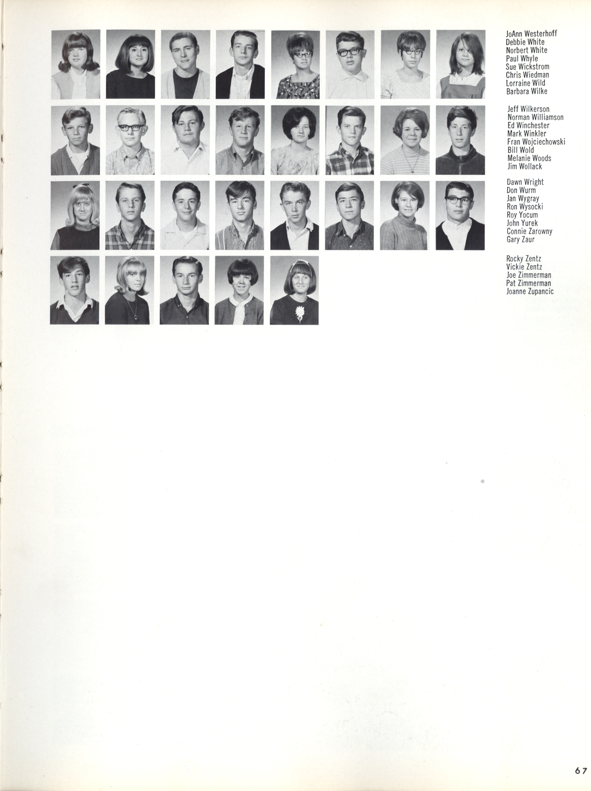 Pictured on Page 67: JoAnn Westerhoff Debbie White Norbert White Paul Whyle Sue Wiskstrom Chris Wiedman Lorraine Wild Barbara Wilke Jeff Wilkerson Norman Williamson Ed Winchester Mark Winkler Fran Wojciehowski Bill Wold Melanie Woods Jim Wollack Dawn Wright Don Wurm Jan Wygray Ron Wysocki Roy Yocum John Yurek Connie Zarowny Gary Zaur Rocky Zentz Vickie Zentz Joe Zimmerman Pat Zimmerman Joanne Zupancic