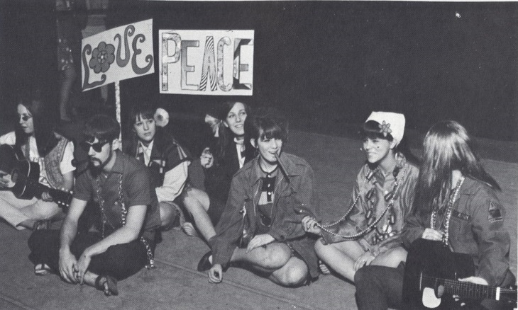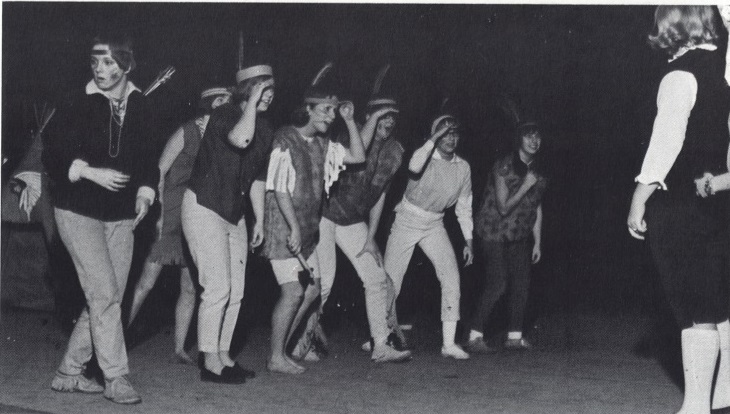 Senior hippies sock it to the audience. CENTER: Junior Indians scout around. |
