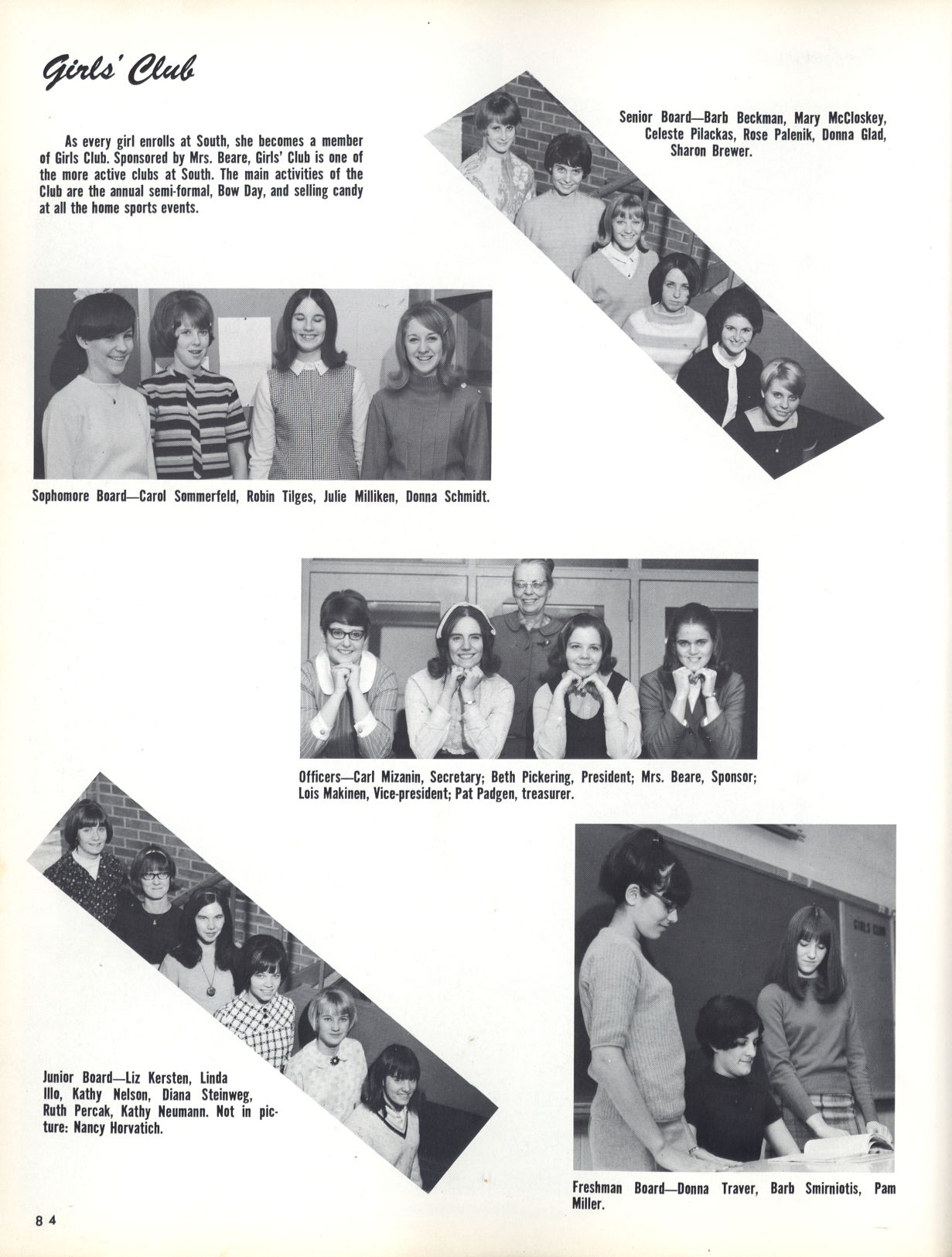 If you like what you see here, please help to keep this website online by purchasing one of my books below. Most are under $9. CAPTION on Page 84: As every girl enrolls at South, she becomes a member of Girls Club. Sponsored by Mrs. Beare, Girls' Club is one of the more active clubs at South. The main activities of the Club are the annual semi-formal, Bow Day, and selling candy at all the home sports events. TOP RIGHT: Senior Board—Barb Beckman, Mary McCloskey, Celeste Pilackas, Rose Palenik, Donna Glad, Sharon Brewer. TOP LEFT: Sophomore Board—Carol Sommerfeld, Robin Tilges, Julie Milliken, Donna Schmidt. CENTER: Officers—Carl Mizanin, Secretary; Beth Pickering, President; Mrs. Beare, Sponsor; Lois Makinen, Vice-president; Pat Padgen, treasurer. BOTTOM LEFT: Junior Board—Liz Kersten, Linda, Illo, Kathy Nelson, Diana Steinweg, Ruth Percak, Kathy Neumann. Not in picture: Nancy Horvatich. BOTTOM RIGHT: Freshmen Board - Donna Traver, Barb Smirniotis, Pam Miller.