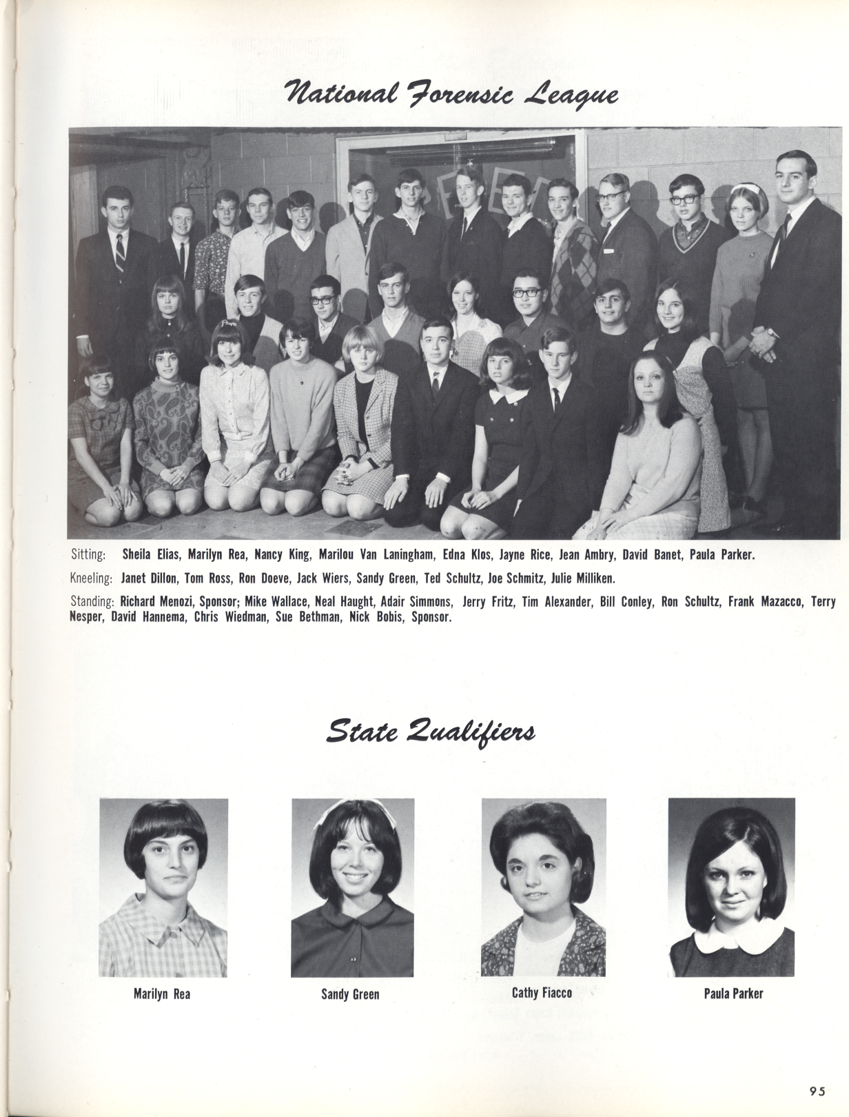 Captions on Page 95: NATIONAL FORENSIC LEAGUE: Sitting: Sheila Elias, Marilyn Rea, Nancy King, Marilou Van Laningham, Edna Klos, Jayne Rice, Jean Ambry, David Banet, Paula Parker. Kneeling: Janet Dillon, Tom Ross, Ron Doeve, Jack Wiers, Sandy Green, Ted Schultz, Joe Schmitz, Julie Milliken. Standing: Richard Menozi, Sponsor; Mike Wallace, Neal Haught, Adair Simmons, Jerry Fritz, Tim Alexander, Bill Conley, Ron Schultz, Frank Mazacco, Terry Nesper, David Hannema, Chris Wiedman, Sue Bethman, Nick Bobis, Sponsor. STATE QUALIFIERS: Marilyn Rea Sandy Green Cathy Fiaaco Paula Parker
