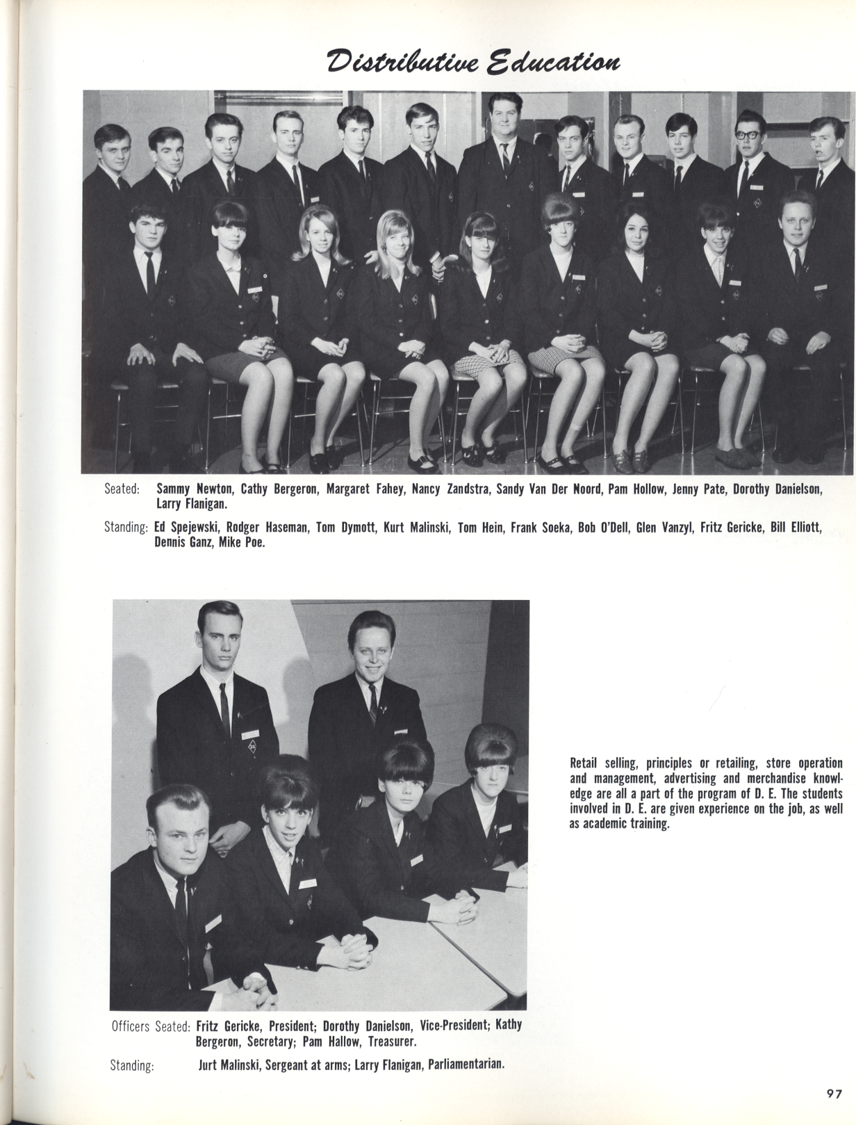 Captions on Page 97: DISTRIBUTIVE EDUCATION:(TOP) Seated: Sammy Newton, Cathy Bergeron, Margaret Fahey, Nancy Zandstra, Sandy Van Der Noord, Pam Hollow, Jenny Pate, Dorothy Danielson, Larry Flanigan. Standing: Ed Spejewski, Rodger Haseman, Tom Dymott, Kurt Malinski, Tom Hein, Frank Soeka, Bob O'Dell, Glen Vanzyl, Fritz Gericke, Bill Elliott, Dennis Ganz, Mike Poe. BOTTOM PHOTO: Officers Seated: Fritz Gericke, President; Dorothy Danielson, Vice-President; Kathy Bergeron, Secretary; Pam Hallow, Treasurer. Standing: Jurt Malinski, Sergeant at arms; Larry Flanigan, Parliamentarian. Retail selling, principles of retailing, store operation and management, advertising, and merchandise knowledge are all a part of the program of D.E.. The students involved in D.E. are given experience on the job, as well as academic training.