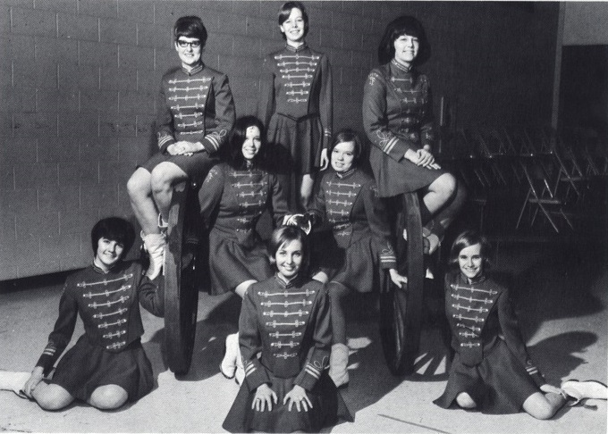 TWIRLERS: - Seated: Jody Stewart, Jeanie Horgeshimer, Cyndee Heintz. On the cannon: Carol Mizanih, Sandy Green, Pat Frantz, Sherry Nondorf, Diane Ahlgrain.