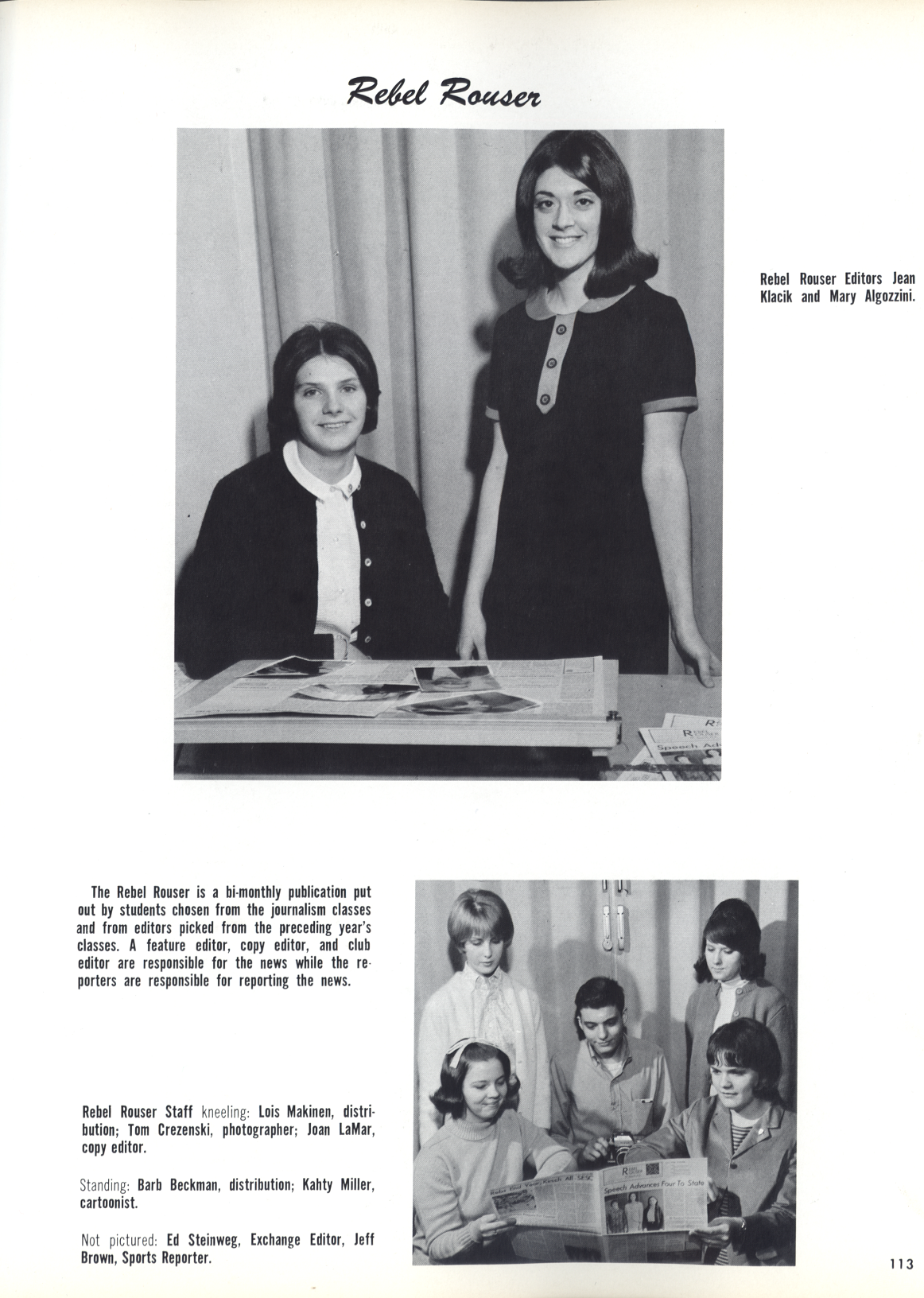 Pictured on Page 113: TOP PHOTO: Rebel Rouser Editors Jean Klacik and Mary Algozzini. CAPTION: The Rebel Rouser is a hi monthly publication put out by students chosen from the journalism classes and from editors picked from the preceding year's classes. A feature editor, copy editor, and club editor are responsible for the news while the re porters are responsible for reporting the news. BOTTOM PHOTO: Rebel Rouser Staff kneeling: Lois Makinen, distribution; Tom Crezenski, photographer; Joan LaMar, copy editor. Standing: Barb Beckman, distribution; Kahty Miller, cartoonist. Not pictured: Ed Steinweg, Exchange Editor, Jeff Brown, Sports Reporter. 113