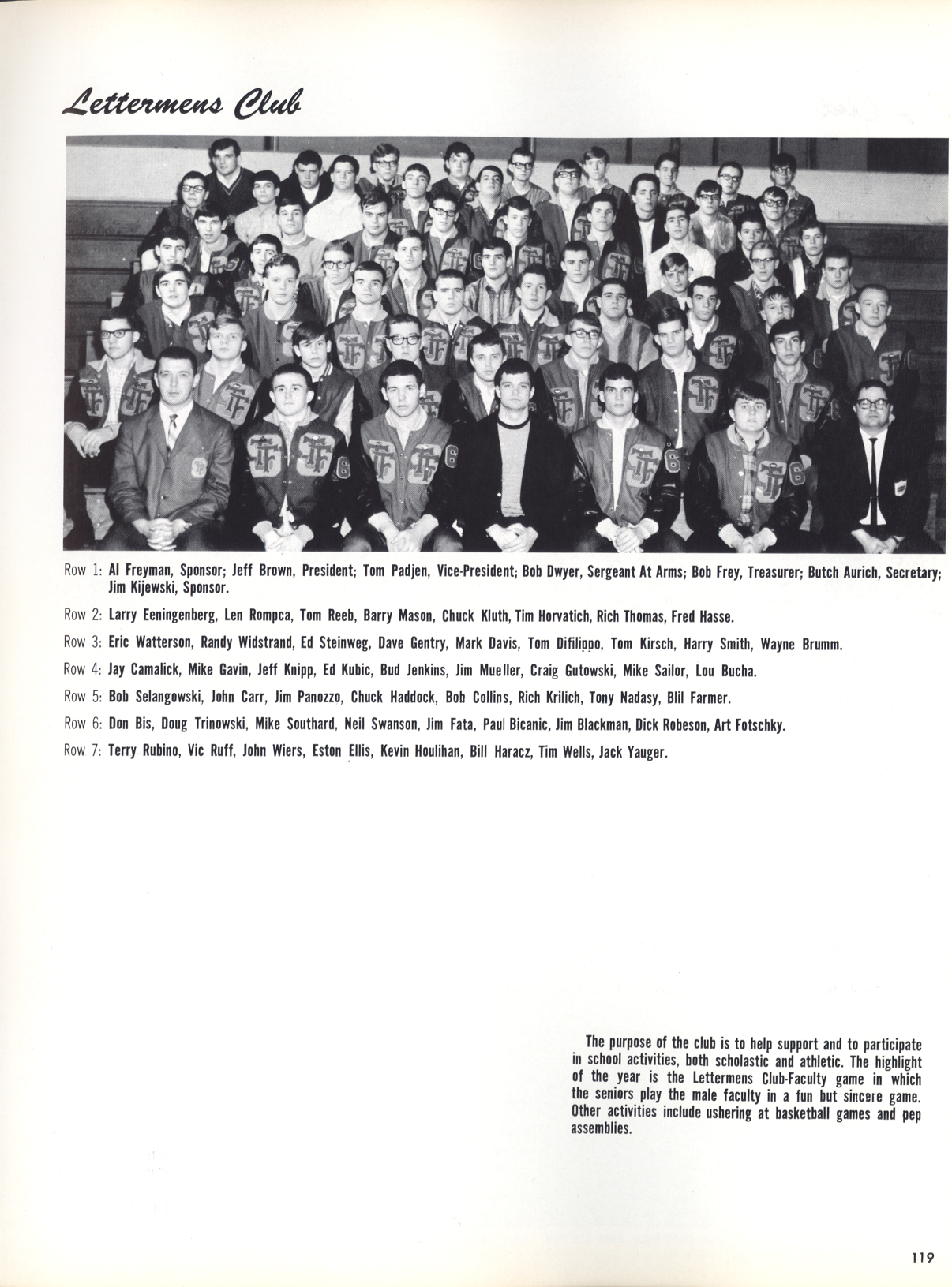 Pictured on Page 119: Row 1: Al Freyman, Sponsor; Jeff Brown, President; Tom Padjen, Vice-President; Bob Dwyer, Sergeant At Arms; Bob Frey, Treasurer; Butch Aurich, Secretary; Jim Kijewski, Sponsor. Row 2: Larry Eeningenberg, Len Rompca, Tom Reeb, Barry Mason, Chuck Kluth, Tim Horvatich, Rich Thomas, Fred Hasse. Row 3: Eric Watterson, Randy Widstrand, Ed Steinweg, Dave Gentry, Mark Davis, Tom Difilippo, Tom Kirsch, Harry Smith, Wayne Brumm. Row 4: Jay Camalick, Mike Gavin, Jeff Knipp, Ed Kubic, Bud Jenkins, Jim Mueller, Craig Gutowski, Mike Sailor, Lou Bucha. Row 5: Bob Selangowski, John Carr, Jim Panozzo, Chuck Haddock, Bob Collins, Rich Krilich, Tony Nadasy, Blil Farmer. Row 6: Don Bis, Doug Trinowski, Mike Southard, Neil Swanson, Jim Fata, Paul Bicanic, Jim Blackman, Dick Robeson, Art Fotschky. Row 7: Terry Rubino, Vic Ruff, John Wiers, Eston Ellis, Kevin Houlihan, Bill Haracz, Tim Wells, Jack Yauger. The purpose of the club is to help support and to participate in school activities, both scholastic and athletic. The highlight of the year is the Lettermens Club-Faculty game in which the seniors play the male faculty in a fun but sincere game. Other activities include ushering at basketball games and pep assemblies.