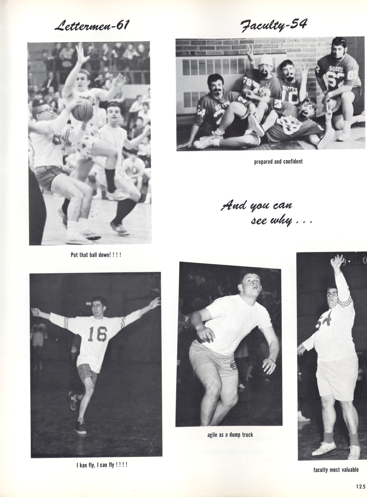 Caption on Page 125: TOP LEFT: Put that ball down!!! TOP RIGHT: prepared and confident BOTTOM :EFT: I kan fly, I can fly!!!! BOTTOM CENTER: agile as a dump truck BOTTOM RIGHT: faculty most valuable