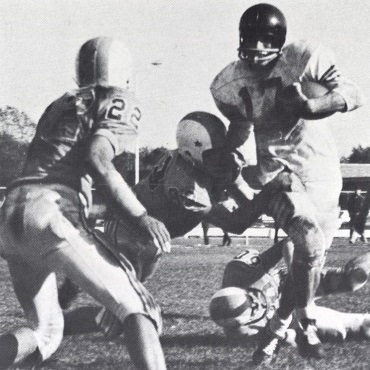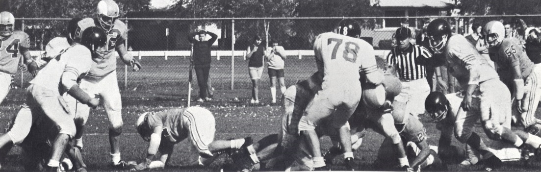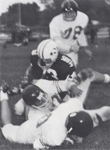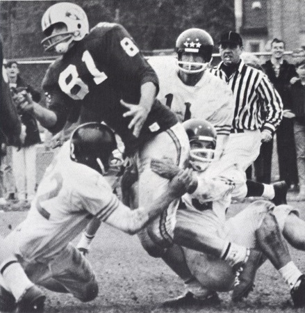 Ed Steinweg, Jim Blackman, and Wayne Brumm bring down North ball carrier. |