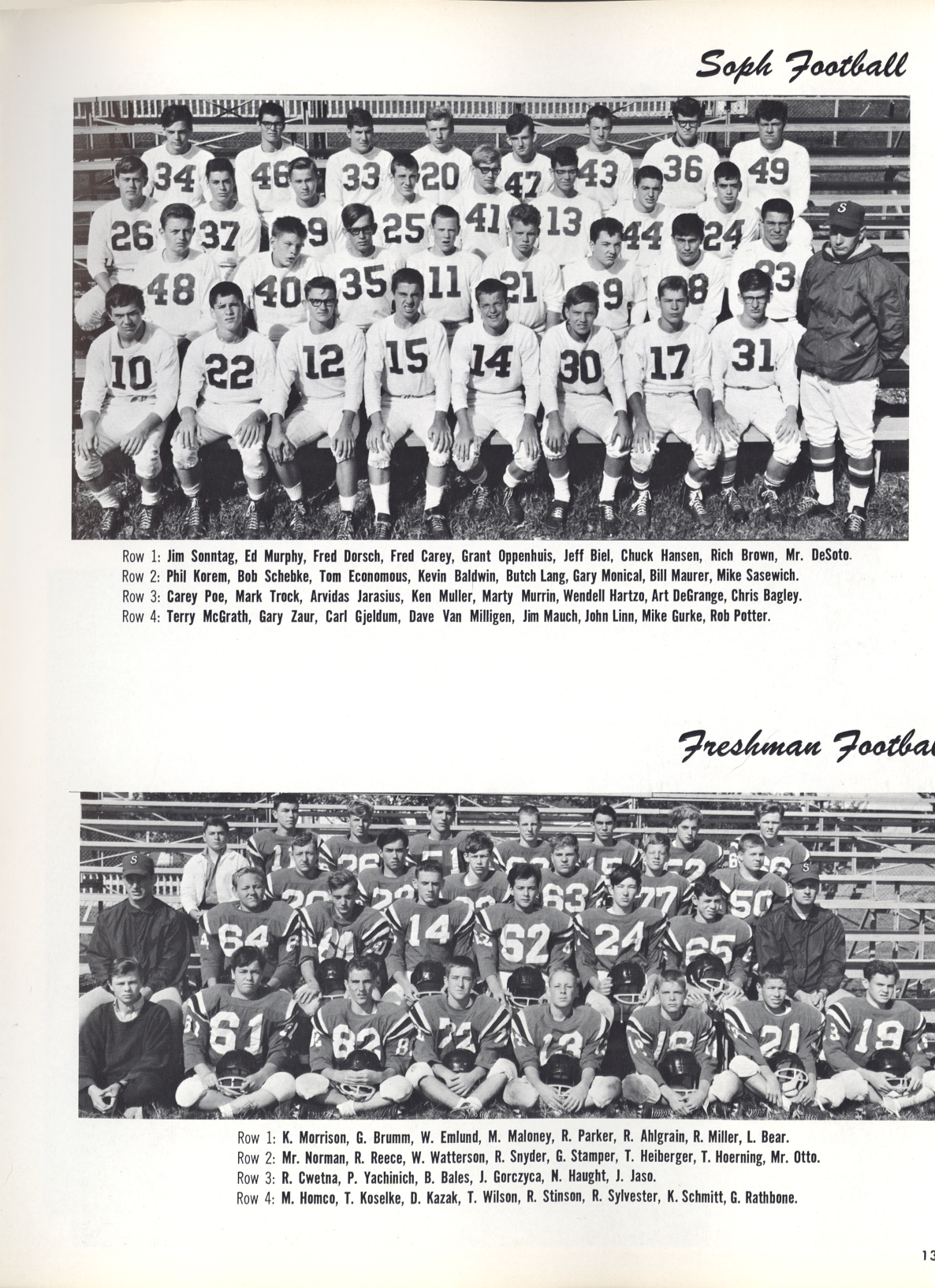 Caption on Page 131: SOPHOMORE FOOTBALL: (TOP) Row 1: Jim Sonntag, Ed Murphy, Fred Dorsch, Fred Carey, Grant Oppenhuis, Jeff Biel, Chuck Hansen, Rich Brown, Mr. DeSoto. Row 2: Phil Korem, Bob Schebke, Tom Economous, Kevin Baldwin, Butch Lang, Gary Monical, Bill Maurer, Mike Sasewich. Row 3: Carey Poe, Mark Trock, Arvidas Jarasius, Ken Muller, Marty Murrin, Wendell Hartzo, Art DeGrange, Chris Bagley. Row 4: Terry McGrath, Gary Zaur, Carl Gjeldum, Dave Van Milligen, Jim Mauch, John Linn, Mike Gurke, Rob Potter. FRESHMAN FOOTBALL:(BOTTOM) Row 1: K. Morrison, Gary Brumm, Wally Emlund, M. Maloney, R. Parker, Rich Ahlgrain, R. Miller, L. Bear. Row 2: Mr. Norman, Roger Reece, W. Watterson, Ron Snyder, George Stamper, T. Heiberger, Tim Hoerning, Mr. Otto. Row 3: Bill Cwetna, P. Yachinich, B. Bales, J. Gorczyca, Neil Haught, J. Jaso. Row 4: Mike Homco, Tim Koselke, D. Kazak, T. Wilson, Rick Stinson, Ron Sylvester, K. Schmitt, Gary Rathbone.