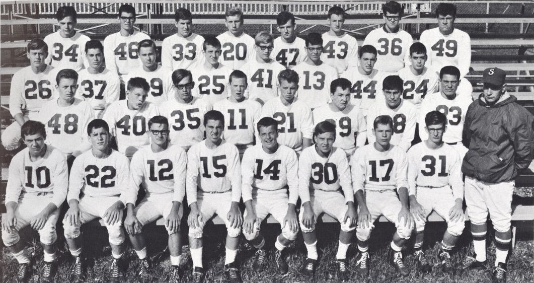 SOPH & FRESHMAN FOOTBALL - 1968 TFS Postscript p131All Conference Team | Varsity in Action | More Varsity | Sophomore & Freshman Football scan | Varsity Cross Country | Varsity Basketball | Var Basketball in Action![]() SOPHOMORE FOOTBALL: Row 1: Jim Sonntag, Ed Murphy, Fred Dorsch, Fred Carey, Grant Oppenhuis, Jeff Biel, Chuck Hansen, Rich Brown, Mr. DeSoto. Row 2: Phil Korem, Bob Schebke, Tom Economous, Kevin Baldwin, Butch Lang, Gary Monical, Bill Maurer, Mike Sasewich. Row 3: Carey Poe, Mark Trock, Arvidas Jarasius, Ken Muller, Marty Murrin, Wendell Hartzo, Art DeGrange, Chris Begley. Row 4: Terry McGrath, Gary Zaur, Carl Gjeldum, Dave Van Milligen, Jim Mauch, John Linn, Mike Gurke, Rob Potter.