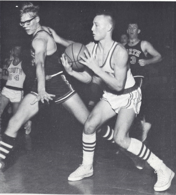 Bob Dwyer crashes through opponents to shoot for score. |