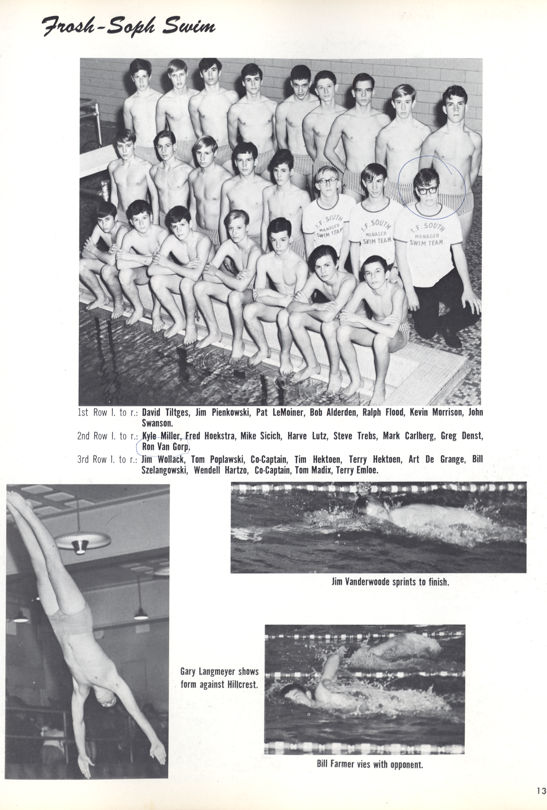 Caption on Page 137: FROSH-SOPH SWIM: (TOP) 1st Row I. to r.: David Tiltges, Jim Pienkowski, Pat LeMoiner, Bob Alderden, Ralph Flood, Kevin Morrison, John Swanson. 2nd Row I. to r.: Kyle Miller, Fred Hoekstra, Mike Sicich, Harve Lutz, Steve Trebs, Mark Carlberg, Greg Denst, Ron Van Gorp. 3rd Row I. to r: Jim Wollack, Tom Poplawski, Co-Captain, Tim Hektoen, Terry Hektoen, Art De Grange, Bill Szelangowski, Wendell Hartzo, Co-Captain, Tom Madix, Terry Emloe. MIDDLE RIGHT: Jim Vanderwoode sprints to finish. LEFT BOTTOM: Gary Langmeyer shows form against Hillcrest. BOTTOM RIGHT: Bill Farmer vies with opponent.