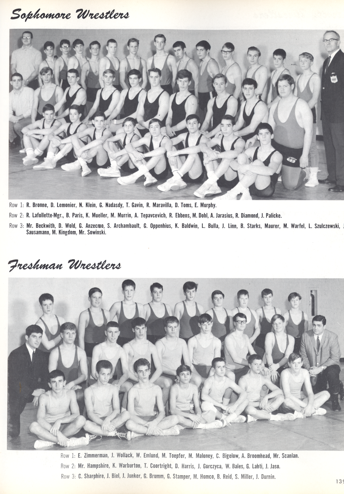 Caption on Page 139: SOPHOMORE WRESTLERS: (TOP) Row 1: R. Bronne, D. Lemonier, N. Klein, G. Nadasdy, T. Gavin, R. Maravilla, D. Toms, E. Murphy. Row 2: R. Lafollette Mgr., B. Paris, K. Mueller, M. Murrin, A. Tepavcevich, R. Ebbens, M. Dohl, A. Jarasius, R. Diamond, J. Palicke. Row 3: Mr. Beckwith, D. Wold, G. Anzecrao, S. Archambault, G. Oppenhius, K. Baldwin, L. Bulla, J. Linn, B. Starks, Maurer, M. Warfel, L. Szulczewski, Sausamann, M. Kingdom, Mr. Sowinski. FRESHMAN WRESTLERS: (BOTTOM) Row 1: E. Zimmerman, J. Wollack, W. Emlund, M. Toepfer, M. Maloney, C. Bigelow, A. Broomhead, Mr. Scanlan. Row 2: Mr. Hampshire, K. Warburton, T. Coortright, D. Harris, J. Gorczyca, W. Bales, G. Lahti, J. Jaso. Row 3: C. Sharphire, J. Biel, J. Junker, G. Brumm, G. Stamper, M. Homco, B. Reid, S. Miller, J. Durnin.