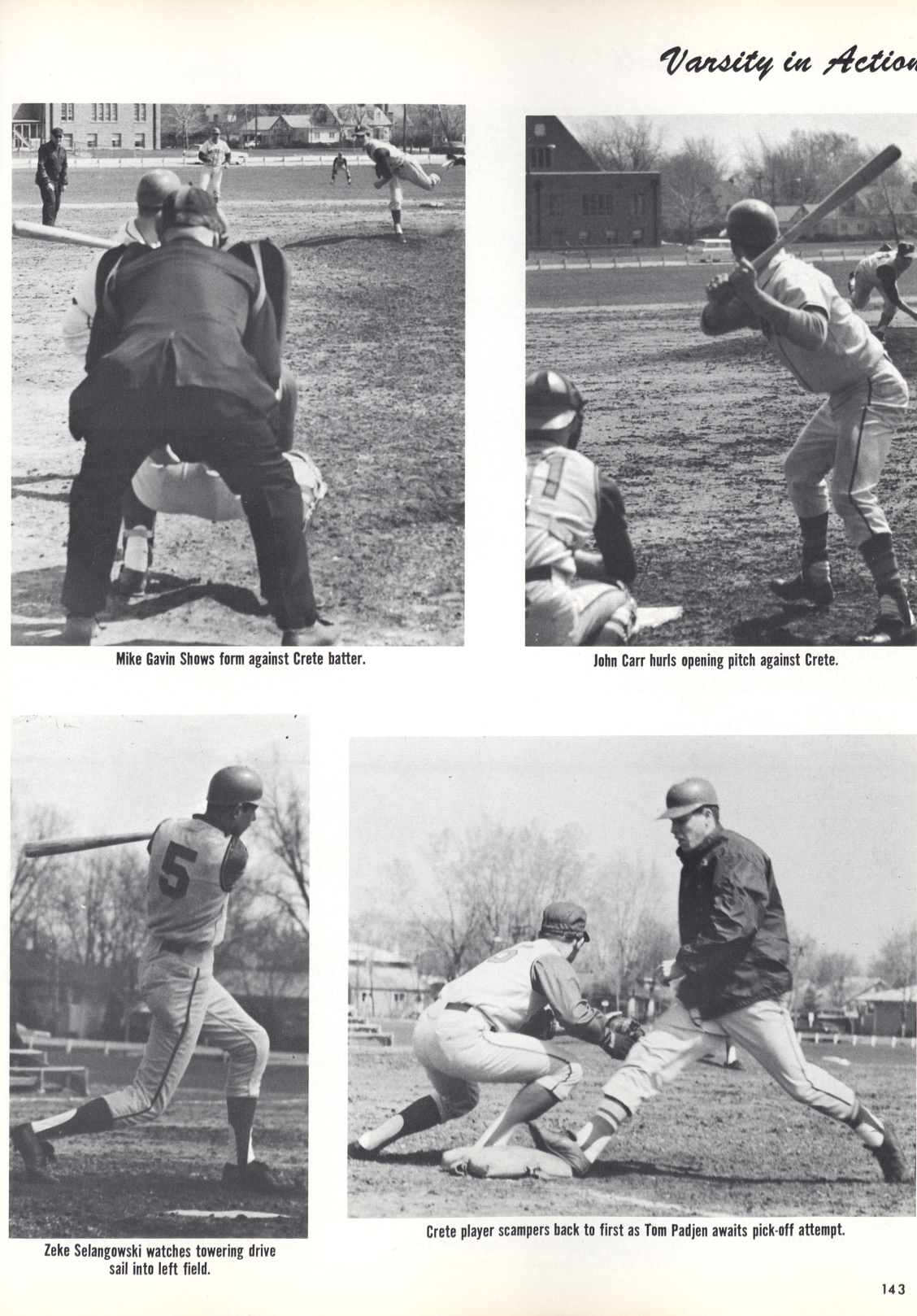 Caption on Page 143: TOP LEFT: Mike Gavin shows form against Crete batter. TOP RIGHT: John Carr opening pitch against Crete. BOTTOM LEFT: Zeke Selangowski watches towering drive sail into left field. BOTTOM RIGHT: Crete player scampers to first as Tom Padjen awaits pick-off attempt.
