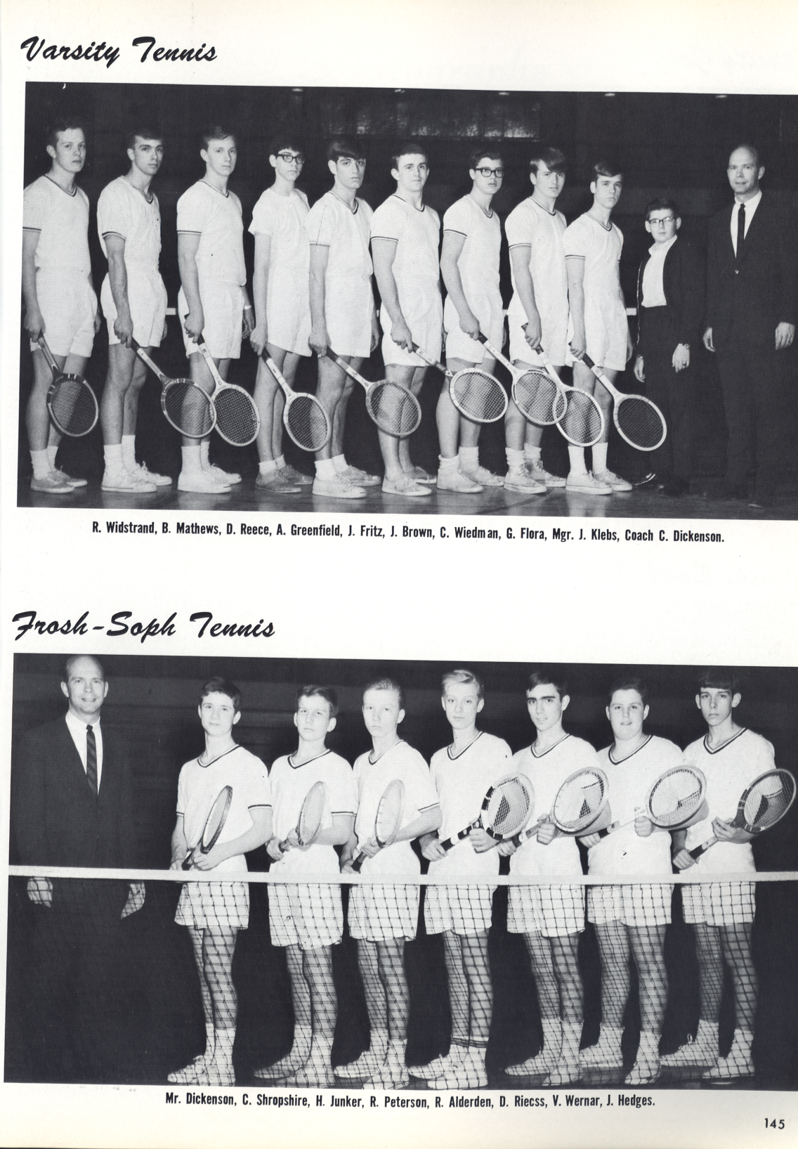 Caption on Page 145: VARSITY TENNIS: (TOP) R. Widstrand, B. Mathews, D. Reece, A. Greenfield, J. Fritz, J. Brown, C. Wiedman, G. Flora, Mgr. J. Klebs, Coach C. Dickenson. FOSH-SOPH TENNIS: (BOTTOM) Mr. Dickenson, Craig Shropshire, Harold Junker, R. Peterson, R. Alderden, Don Riecss, Vern Werner, Tom Hedges.