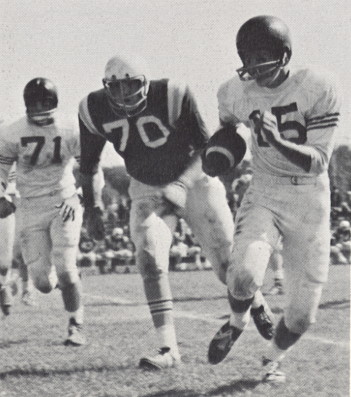 Harry Baran clears path for halfback Bruce Quenzler in game against Tinley Park. |