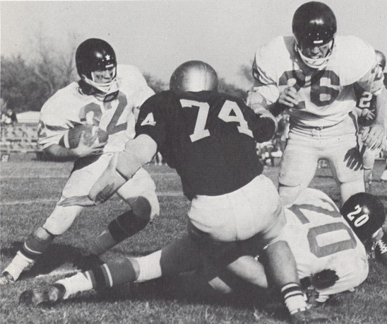 Halfback Bruce Quenzler fakes would-be tackler and scampers for more yardage.