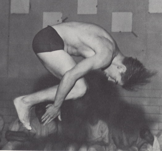 Chris Hildebrand shows good form coming out of tuck in diving contest. |